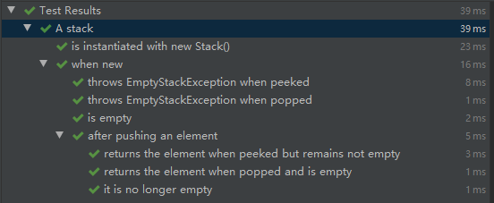 1 2 3 4 5 6 7 8 9 10 11 12 13 14 15 16 17 18 19 20 21 22 23 24 25 26 27 28 29 30 31 32 33 34 35 36 37 38 39 40 41 42 43 44 45 46 47 48 49 50 51 52 53 54 55 56 57 58 59 60 61 62 63 64 65 66 67 68 69 70 71 @DisplayName("A stack") class TestingAStackDemo { Stack<Object> stack; @Test @DisplayName("is instantiated with new Stack()") void isInstantiatedWithNew () { new Stack <>(); } @Nested @DisplayName("when new") class WhenNew { @BeforeEach void createNewStack () { stack = new Stack <>(); } @Test @DisplayName("is empty") void isEmpty () { assertTrue(stack.isEmpty()); } @Test @DisplayName("throws EmptyStackException when popped") void throwsExceptionWhenPopped () { assertThrows(EmptyStackException.class, stack::pop); } @Test @DisplayName("throws EmptyStackException when peeked") void throwsExceptionWhenPeeked () { assertThrows(EmptyStackException.class, stack::peek); } @Nested @DisplayName("after pushing an element") class AfterPushing { String anElement = "an element" ; @BeforeEach void pushAnElement () { stack.push(anElement); } @Test @DisplayName("it is no longer empty") void isNotEmpty () { assertFalse(stack.isEmpty()); } @Test @DisplayName("returns the element when popped and is empty") void returnElementWhenPopped () { assertEquals(anElement, stack.pop()); assertTrue(stack.isEmpty()); } @Test @DisplayName("returns the element when peeked but remains not empty") void returnElementWhenPeeked () { assertEquals(anElement, stack.peek()); assertFalse(stack.isEmpty()); } } } }